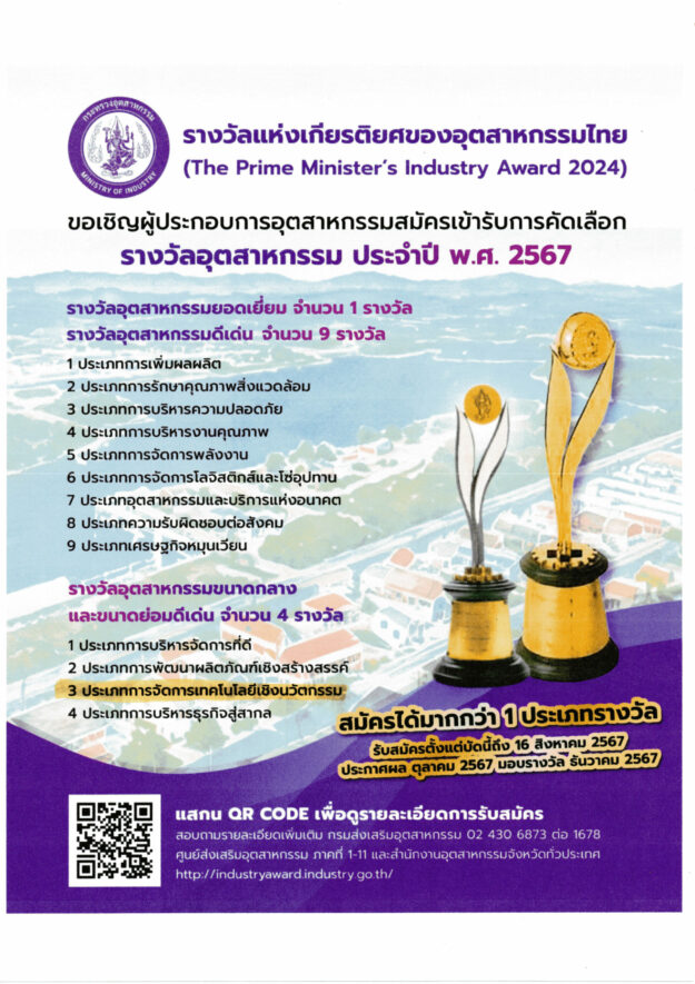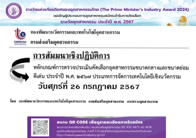 รับสมัครเข้าร่วมการสัมมนาเชิงปฏิบัติการให้กับผู้ประกอบการ SME และ เข้ารับการคัดเลือกรางวัลอุตสาหกรรมดีเด่น ประจำ 2567 ประเภทการจัดการเทคโนโลยีเชิงนวัตกรรม