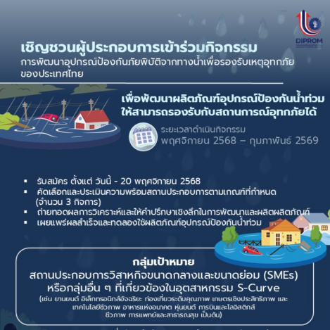 เชิญชวนผู้ประกอบการเข้าร่วมกิจกรรมการพัฒนาอุปกรณ์ป้องกันภัยพิบัติจากทางน้ำเพื่อรองรับเหตุอุทกภัยของประเทศไทย