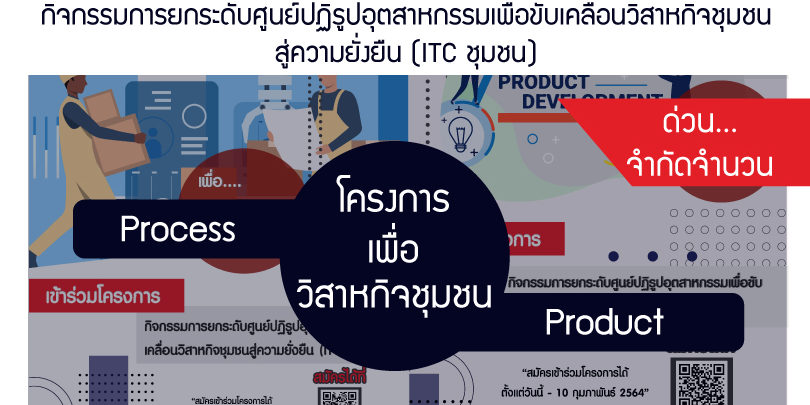 กองพัฒนานวัตกรรมและเทคโนโลยีอุตสาหกรรม กรมส่งเสริมอุตสาหกรรม ศูนย์ปฏิรูปอุตสาหกรรม (ศูนย์ ITC) และ สถาบันพลาสติก จึงได้จัดกิจกรรมการยกระดับศูนย์ปฏิรูปอุตสาหกรรมเพื่อขับเคลื่อนวิสาหกิจชุมชน สู่ความยั่งยืน (ITC ชุมชน) เพื่อเป็นการเสริมสร้างความแข็งแรง ที่สามารถแข่งขันกับสภาวะรอบข้างของธุรกิจที่มีการแข่งขันสูง พร้อมต้องต่อสู้กับวิกฤตอย่างไวรัส Covid19 ได้อย่างมีประสิทธิภาพ เติบโตได้อย่างมั่นคง