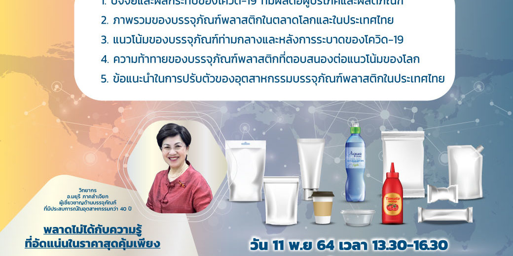 พบกับหลักสูตรแนวโน้มบรรจุภัณฑ์เข้มข้น ที่จะทำให้ผู้ประกอบการด้านบรรจุภัณฑ์พลาสติก รู้ซึ้ง รู้ลึก ไม่ตกเทรนด์ อยู่รอดในวิกฤตการณ์ทั้งปัญหาโรคระบาด และปัญหาเศรษฐกิจ