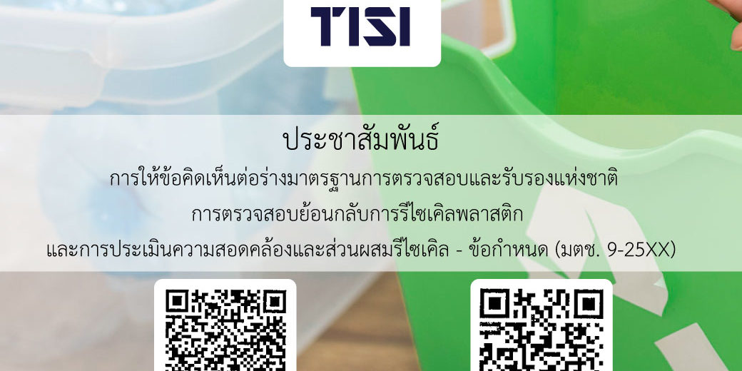 สำนักงานมาตรฐานผลิตภัณฑ์อุตสาหกรรม จึงขอเรียนเชิญผูประกอบการและผู้ที่สนใจ ร่วมเป็นส่วนหนึ่งในการแสดงข้อคิดเห็นร่างมาตรฐานตรวจสอบและรับรองแห่งชาติ การตรวจสอบย้อนกลับการรีไซเคิลพลาสติก และการประเมินความสอดคล้องและส่วนผสมรีไซเคิล – ข้อกำหนดมาตรฐานเลขที่ มตช. 9-25xx