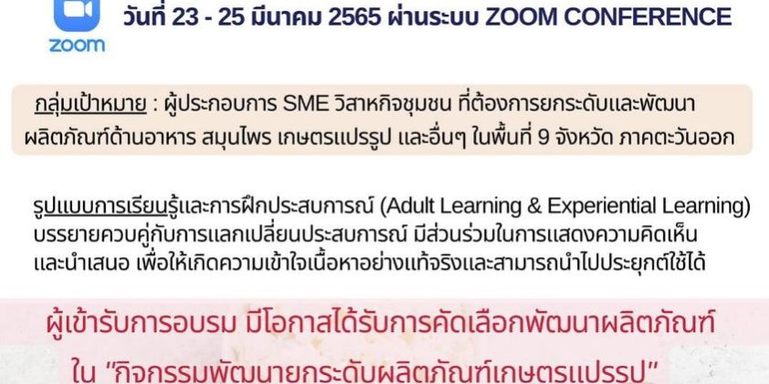 กลุ่มเป้าหมาย ผู้ประกอบการ SME วิสาหกิจชุมชน ที่ต้องการยกระดับและพัฒนาผลิตภัณฑ์ด้านอาหาร สมุนไพร เกษตรแปรรูป และอื่นๆ ในพื้นที่ 9 จังหวัด ภาคตะวันออก