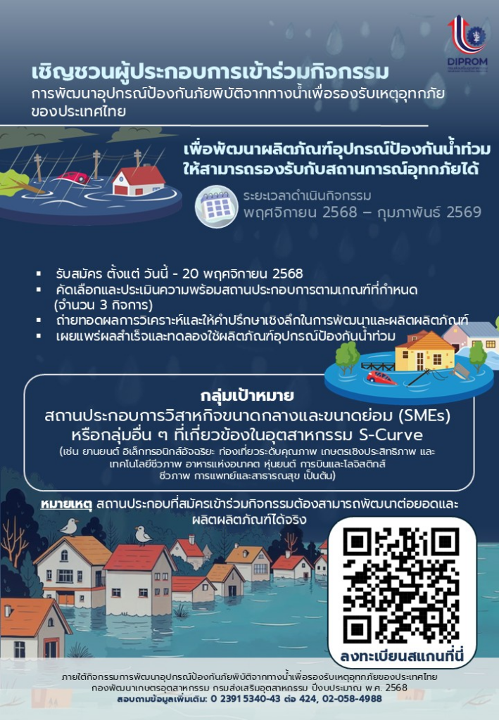 เชิญชวนผู้ประกอบการที่สนใจ ร่วมเป็นส่วนหนึ่งในการขับเคลื่อนและพัฒนาผลิตภัณฑ์อุปกรณ์ป้องกันน้ำท่วม เพื่อต่อยอดใช้งานจริง